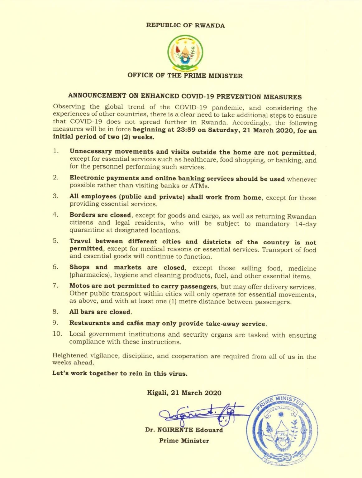 Meanwhile, Rwanda has become the first country in the region to impose a shutdown in order to try and contain the virus. The country so far has 17 confirmed cases. The shutdown means that citizens will no longer be able to leave their homes except for medical treatment, other essential services or groceries. Rwanda has also closed its borders, with goods and cargo and returning citizens required to quarantine for two weeks. The measures were introduced as of 23:59 on 21/03/2020 for a period of two weeks.