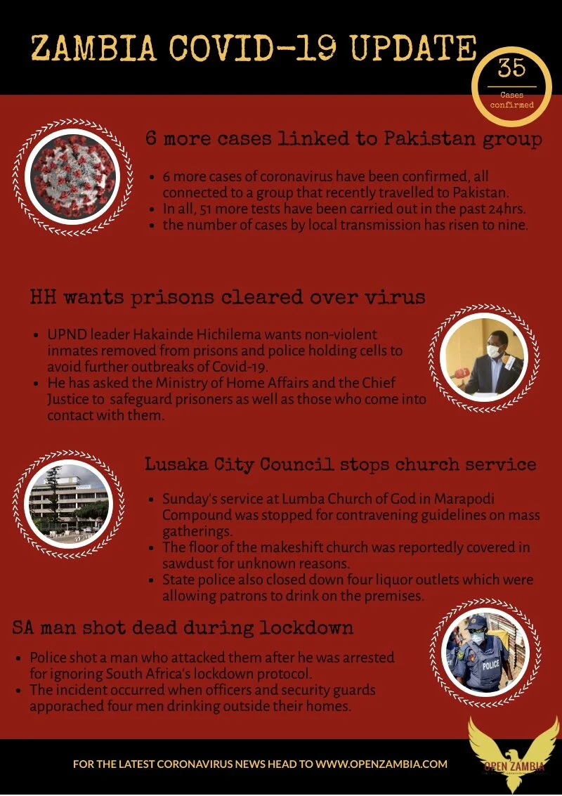 Coronavirus Update: 35 Cases Confirmed Open ZambiaMarch 30, 2020Comment Facebook0 Twitter Pinterest0 0 Likes
