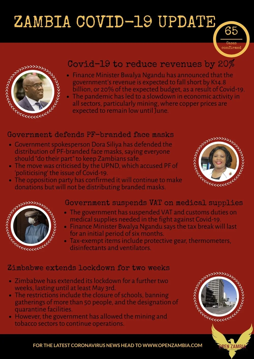 Covid-19 Update: 65 Cases Confirmed Open ZambiaApril 20, 2020Comment Facebook0 Twitter Pinterest0 0 Likes