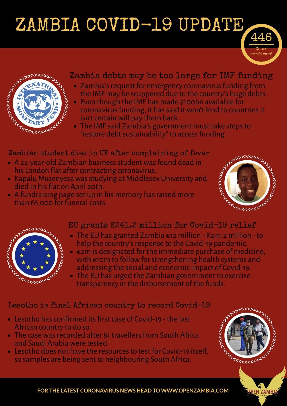 Covid-19 Update: 446 Cases Confirmed Open ZambiaMay 13, 2020Comment Facebook0 Twitter Pinterest0 0 Likes