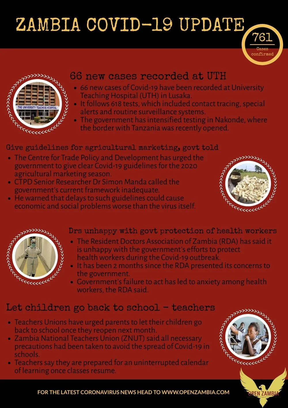 Covid-19 Update: 761 Cases Confirmed Open ZambiaMay 18, 2020Comment Facebook0 Twitter Pinterest0 0 Likes