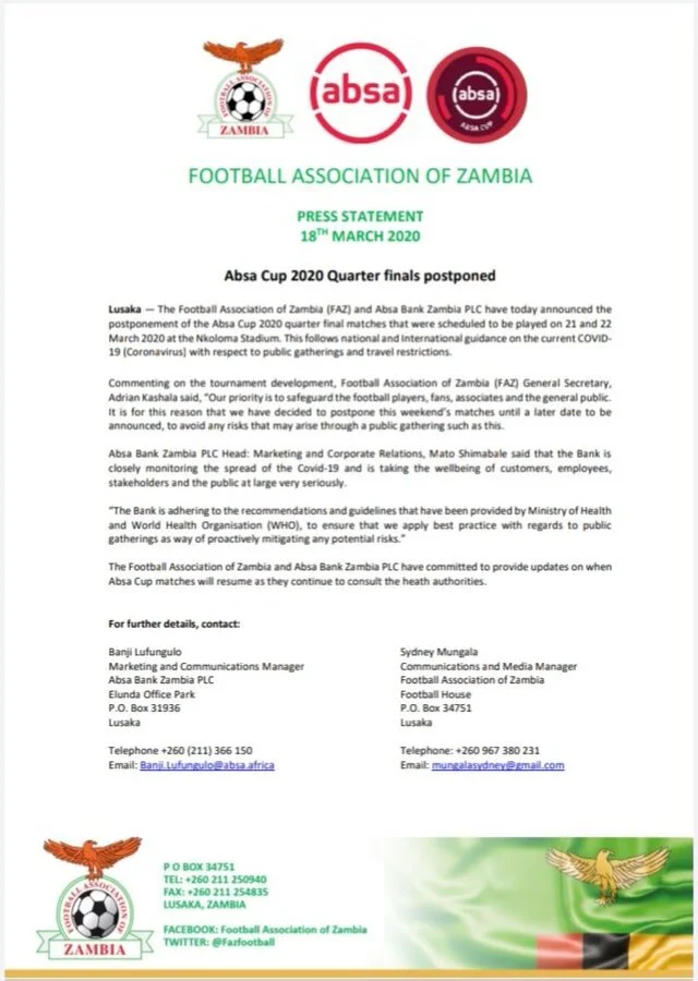 The Football Association of Zambia (FAZ) and Absa Bank Zambia PLC have today announced the postponement of the Absa Cup 2020 quarter final matches that were scheduled to be played on 21 and 22 March 2020 at the Nkoloma Stadium. This follows national and international guidance on the current COVID-19 (Coronavirus) with respect to public gatherings and travel restrictions.